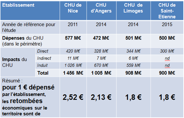 Au-delà des aspects strictement sanitaires, plusieurs établissements ont souhaité évaluer les retombées économiques de leurs activités sur leurs territoires. Par exemple, 4 CHU (Nice, Angers, Saint-Etienne, Limoges), à des dates distinctes, ont demandé à des organismes d’études ou consulaires de type Chambre de Commerce et d’Industrie (CCI) de chiffrer leur contribution à l’économie locale.
