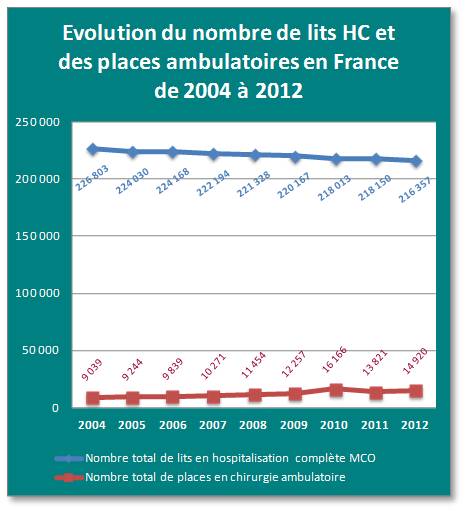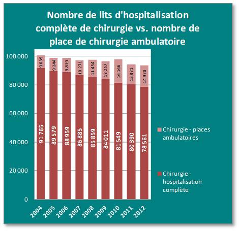 Si en 2004, le parc de places de chirurgie ambulatoire représentait 9,0% des capacités totales de chirurgie, en 2012, ce taux atteignait 16,0 %.